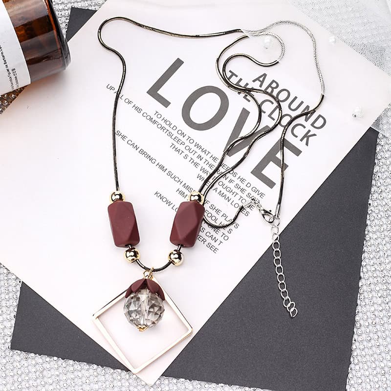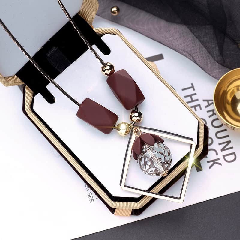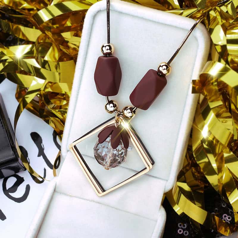 שרשרת מצופה שחור וזהב עם חרוזים חום יין ותליון קריסטל